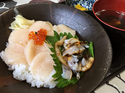 おがつ店こ屋街「伝八寿司」さんの「ホタテ丼」です。雄勝と…